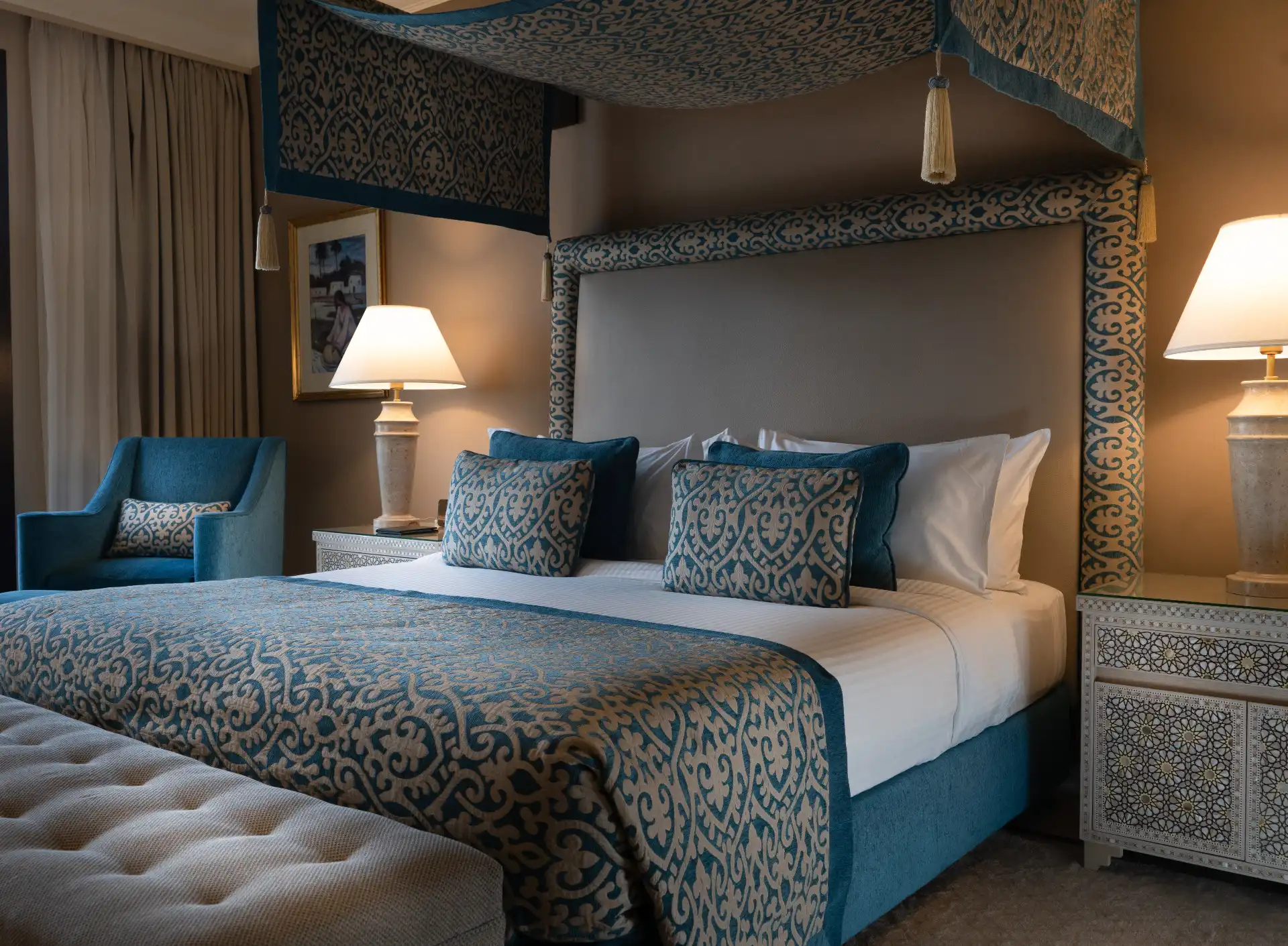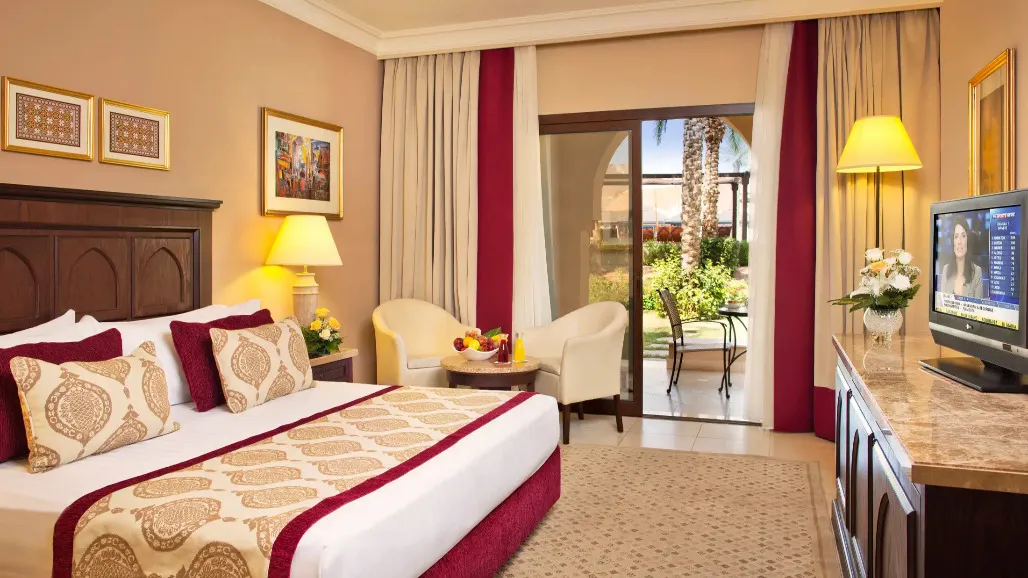 Rooms open to garden, pool, or sea views with an Arab-Moorish look.